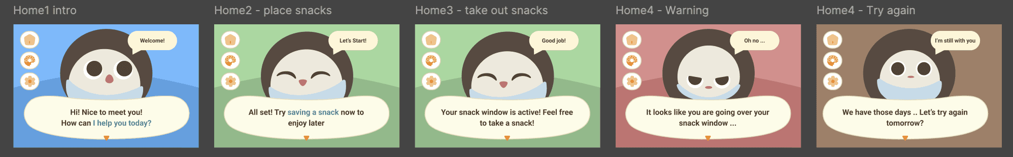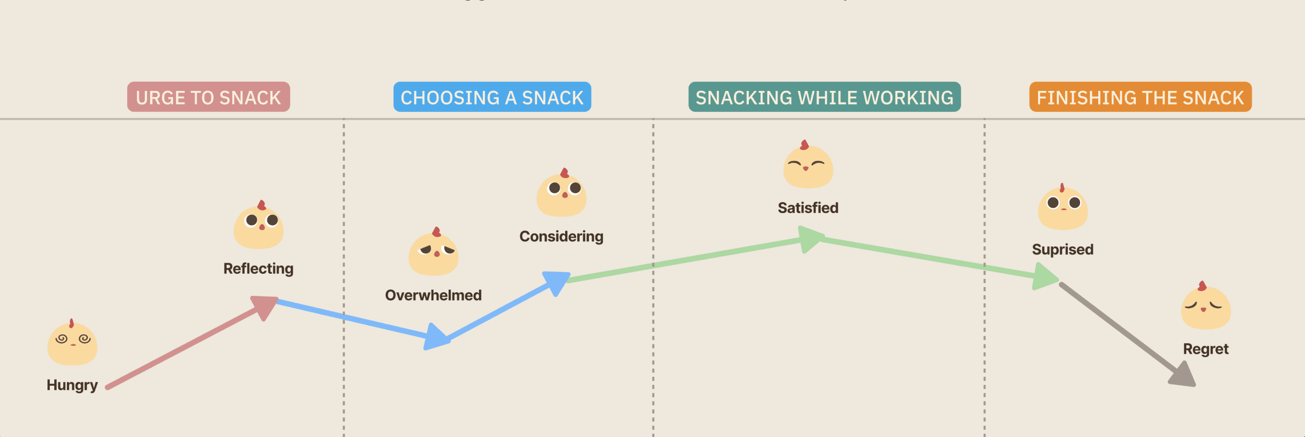 I mapped key points across the snack experience: from the urge to snack, to choosing a snack, snacking during tasks, and reflecting afterward. We identified four design opportunities: